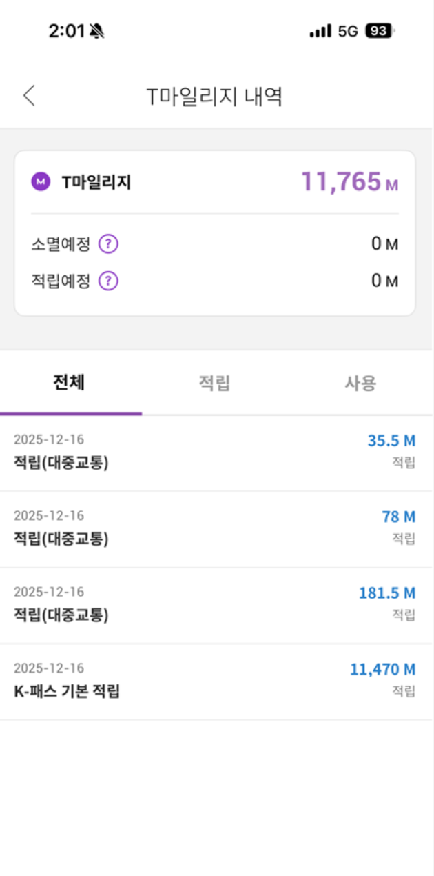 이렇게 뜨는데 맨 아래 T마일리지 항목이 있다. 이걸 눌러보면