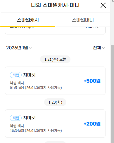 1월 30일까지 가능하고 스마일캐시 유효기간은 1월30일까지다 모아서 1월 30일에 쓰면 된다.