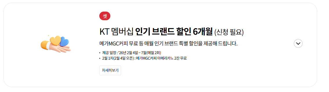 KT 멤버십 인기 브랜드 6개월동안 매월 2회 준다. 2월1차는 메가 커피 아메리카노 2잔 무료이다.