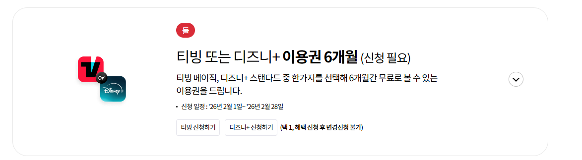 티빙 또는 디즈니+ 이용권 6개월권 준다. 2월중으로 신청을 해야 한다.
