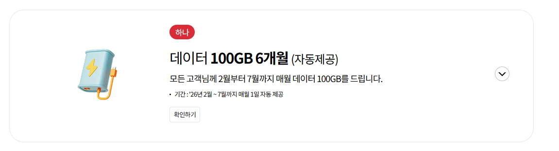 첫번째 2월부터 7월까지 매월 데이터 100GB 준다. 고용금제 쓰는 사람은 살짝 낮춰서 써도 나쁘지 않을듯