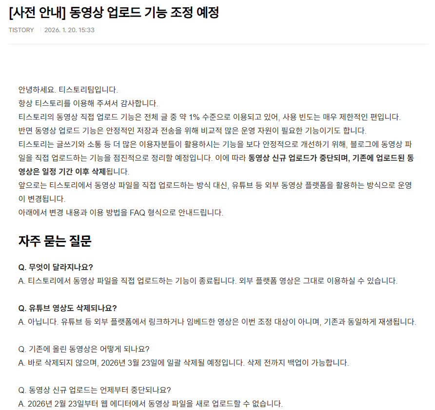 티스토리 동영상 신규 업로드가 중단되며, 기존에 업로드된 동영상은 일정 기간 이후 삭제