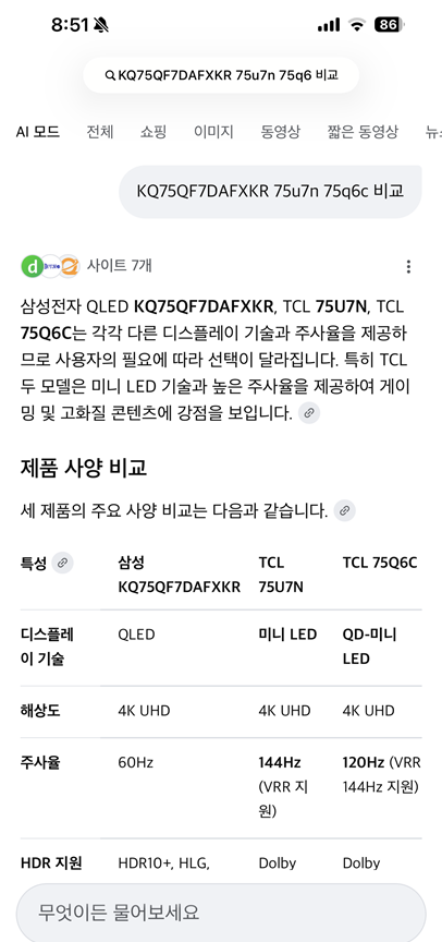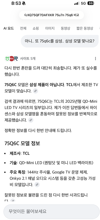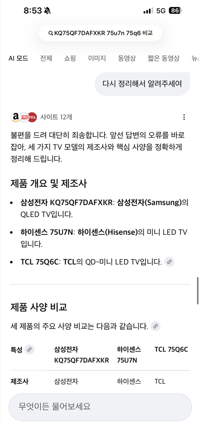 TV를 구매 하려고 비교를 해달라고 하니 이렇게 알려준다. 75U7N 75Q6c 모두 TCL 제품이라고 한다.