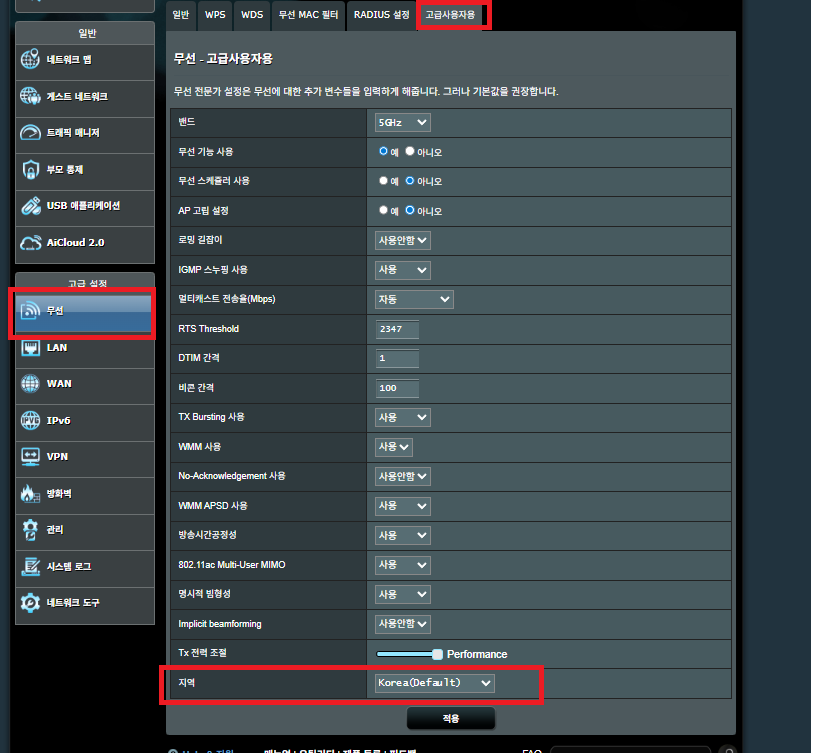 무선 - 고급사용자용 - 지역을 미국으로 변경을 해주면