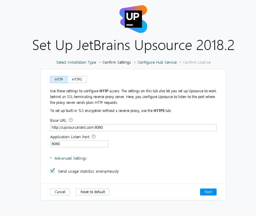# ./upsource.sh configure --listen-port 8080 --base-url http://upsource.test.com:8080 = 포트 및 url 설정