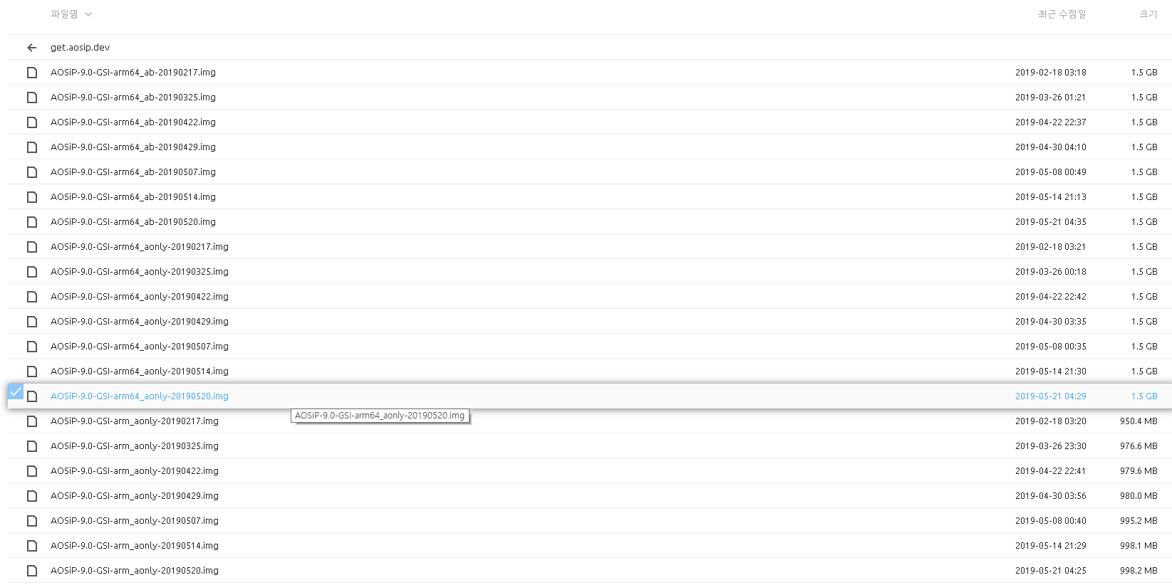 Install 모드 들어가서 AOSiP-9.0-GSI-arm64_aonly-20190520.img 설치 해주자