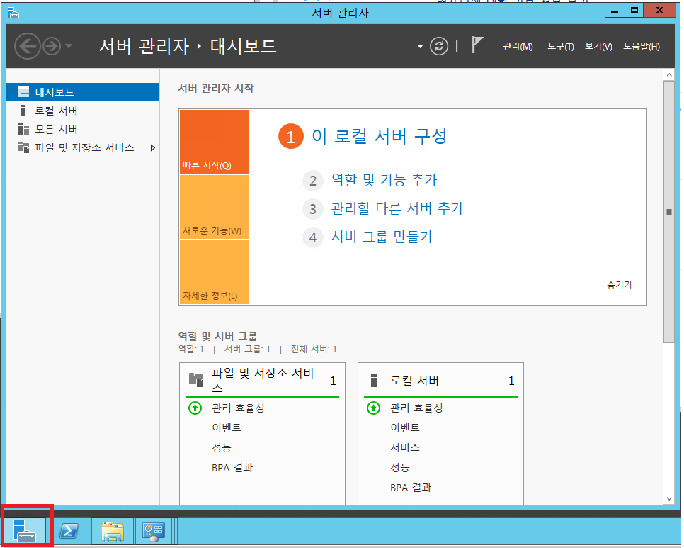 아래 시작 버튼 있는곳에 클릭 하면 서버 관리자가 열림