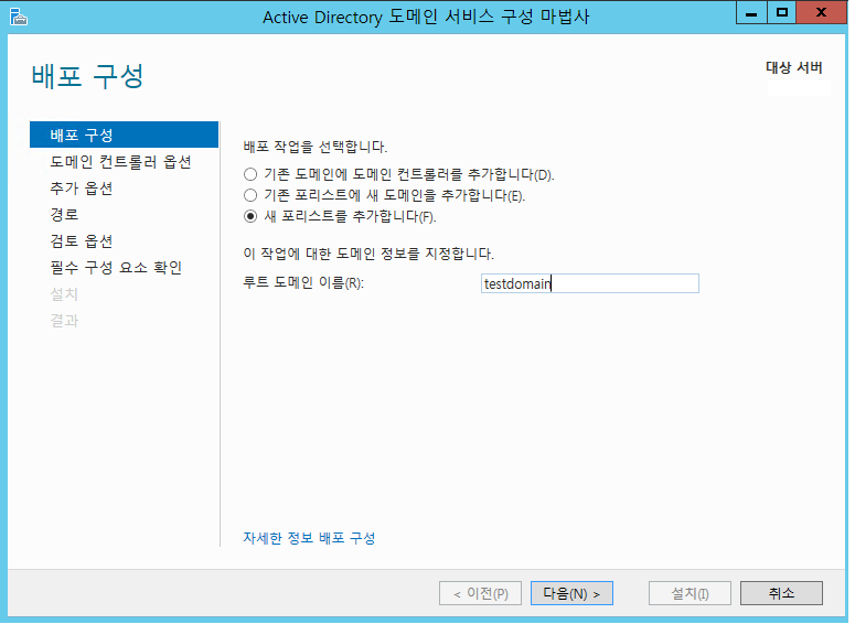 새 포리스트를 추가 선택 - 루트 도메인 이름 입력 후 다음