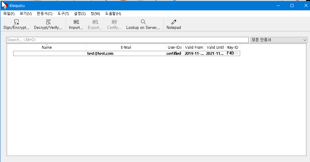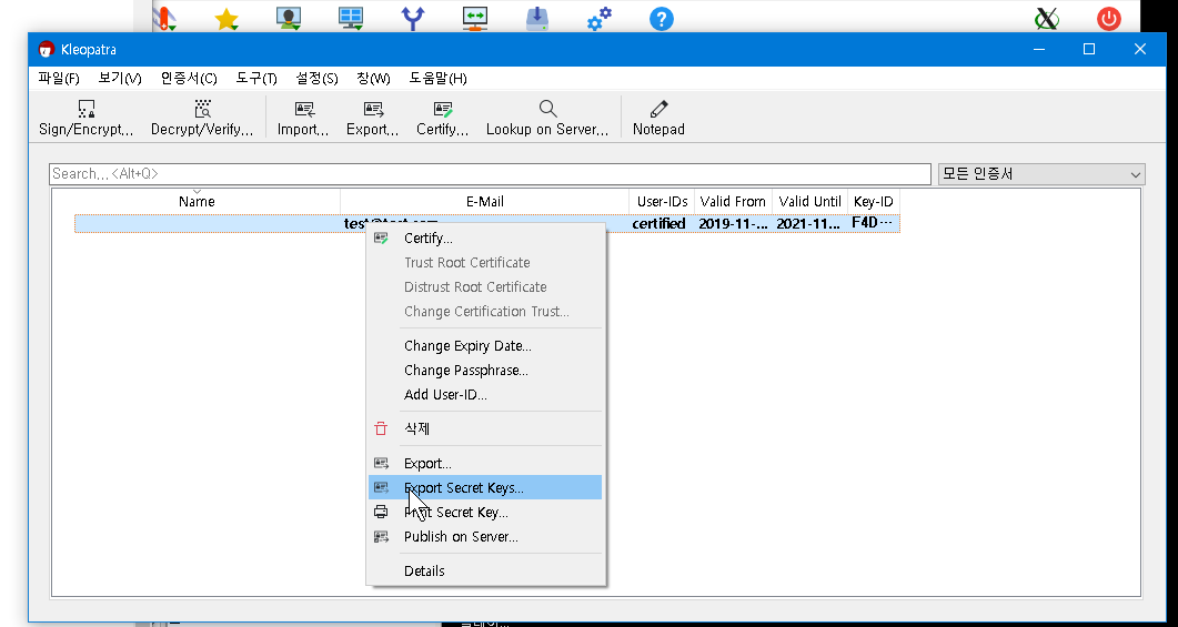 export secret key 누르면 asc 형태로 파일을 내보낼수 있는데 이 파일이 키값이라고 생각하면 된다.