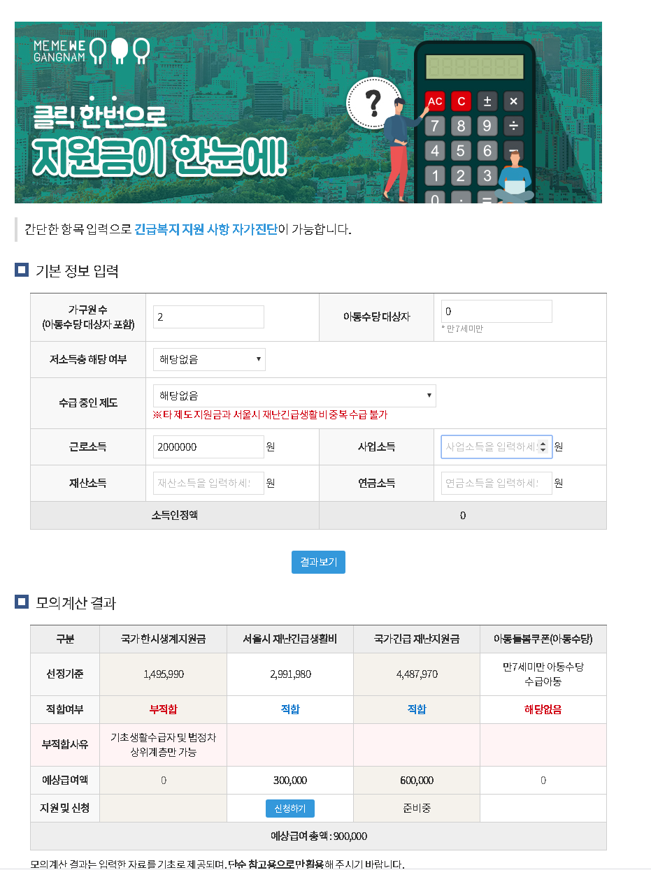 간단한 항목 입력으로 긴급복지 지원 사항 자가진단이 가능합니다.기본 정보 입력기본정보입력기본 정보 입력 : 가구원수, 아동수당 대상 아동수, 수급자 종류 선택, 타제도 지원여부 선택, 근로소득, 사업소득, 재산소득, 연금소득, 소득인정액을 보여주는 테이블가구원 수(아동수당 대상자 포함)아동수당 대상자* 만 7세 미만저소득층 해당 여부선택해당없음생계의료급여수급자주거교육급여수급자차상위수급 중인 제도선택해당없음저소득층 한시생활지원사업 대상자(국민기초수급자, 차