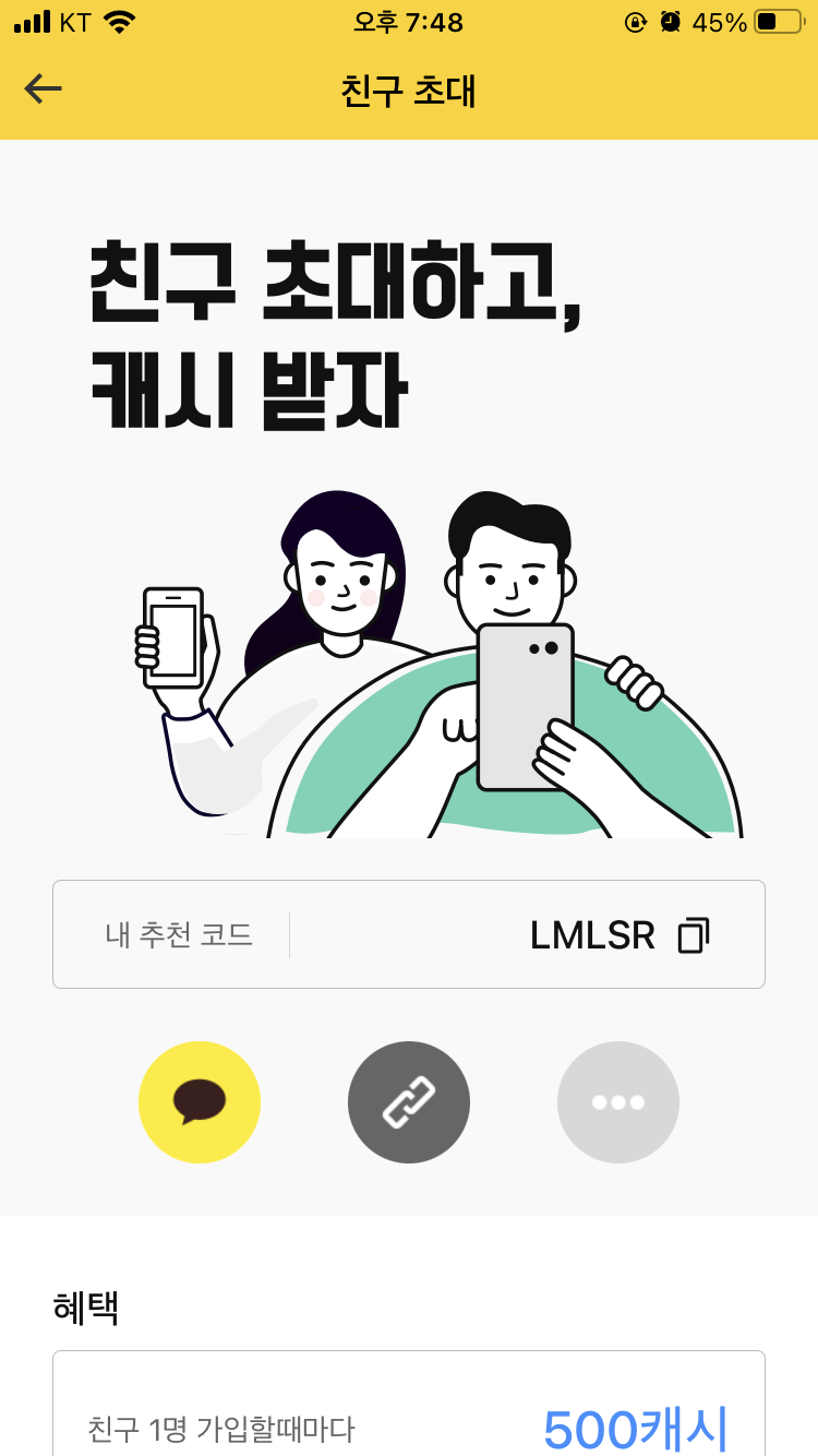 가입할때 추천인 코드를 입력하면 500캐시를 받을 수 있습니다.