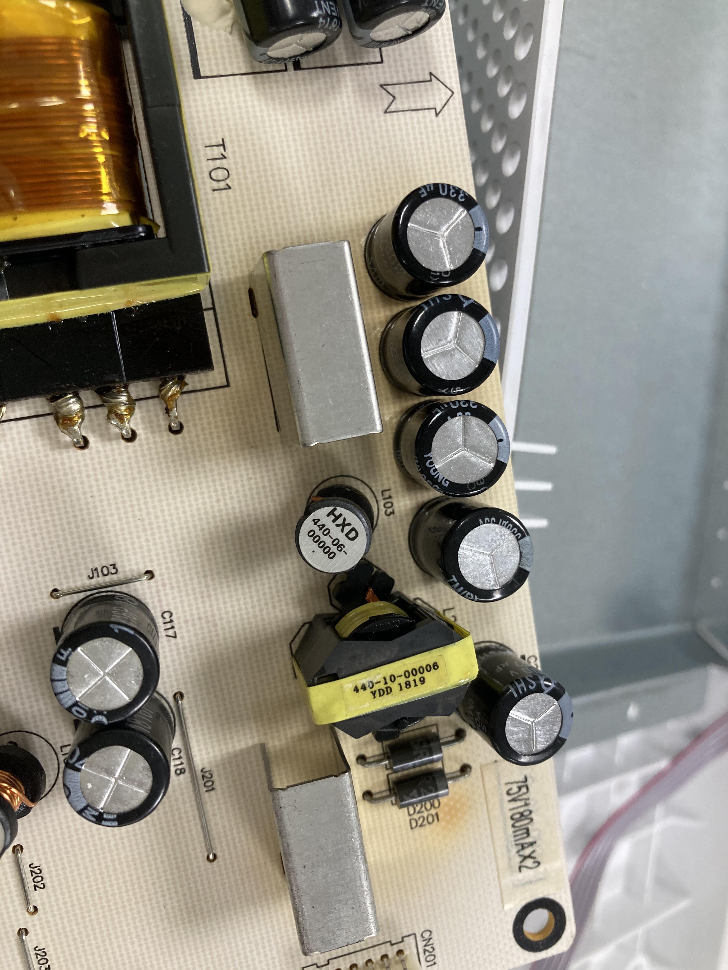 사진상으로는 잘 안보이지만 오른쪽 연속으로 있는 12345 중에 4번 빼고 다 배불뚝이다. 콘덴서가 터진것이다.