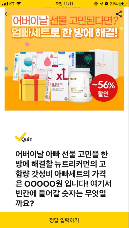 캐시워크 퀴즈 어버이날 아빠 선물 고민을 한방에 해결할 뉴트리커먼의 고함량 갓성비 아빠세트의 가격은