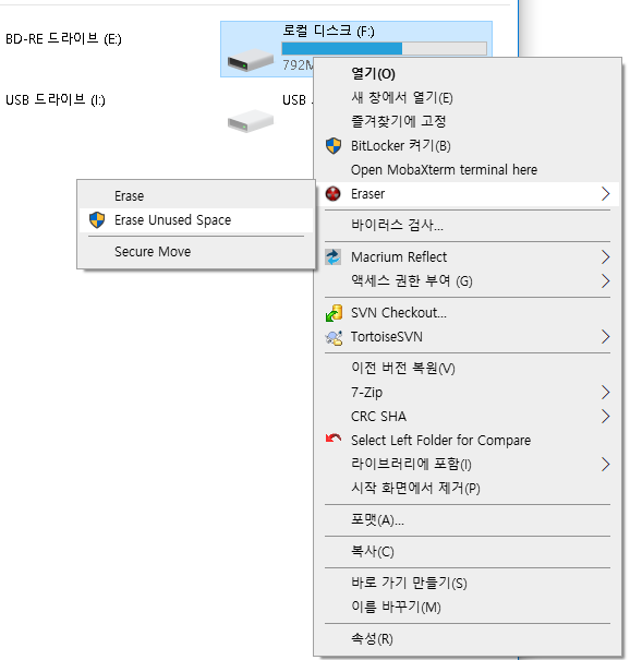 erase unsued space 는 해당 데이터 외 공간을 모두 영구 삭제(복구 불가능하게) 가능하다.