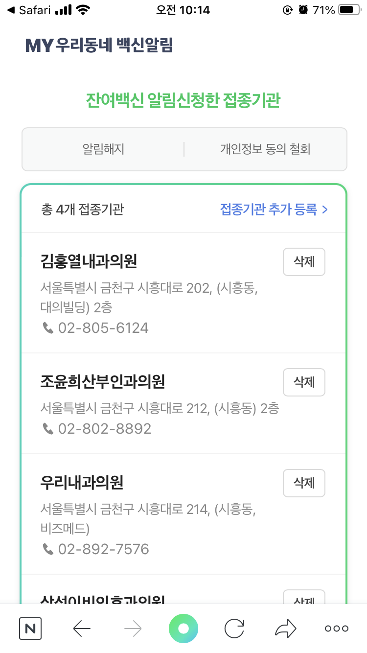 내가 신청한 병원들 리스트다 다 삭제 하면 더이상 알림이 오지 않는다.