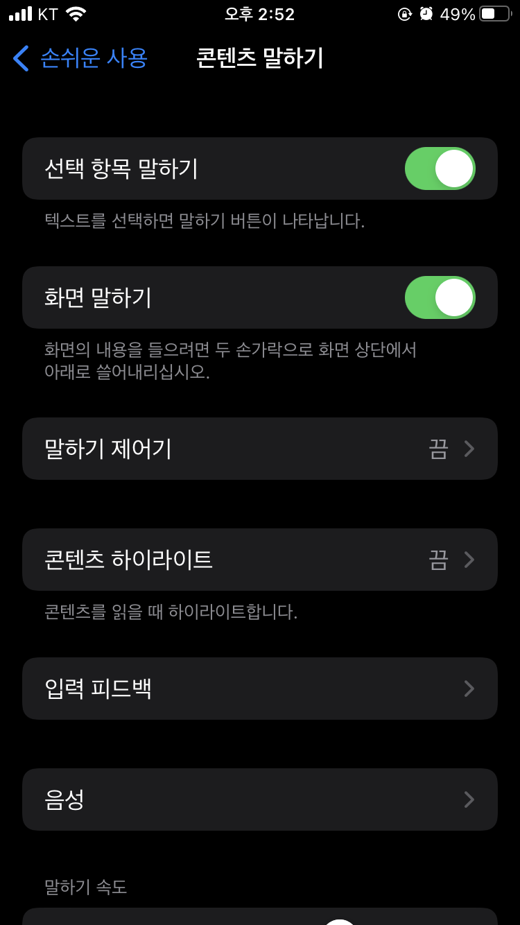 선택 항목 말하기 와 아래에 있는 화면 말하기를 체크 해주자