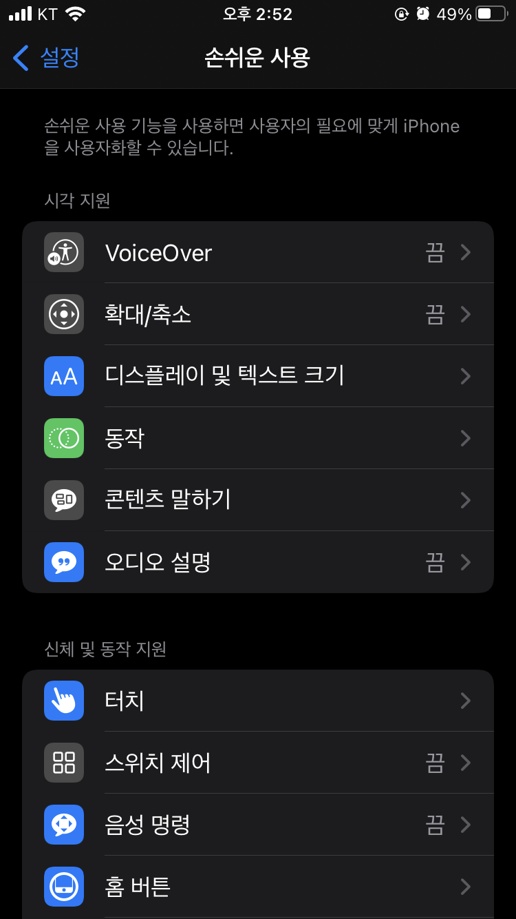 아래 내용 보면 손쉬운 사용 메뉴가 있다 눌러서 들어가면