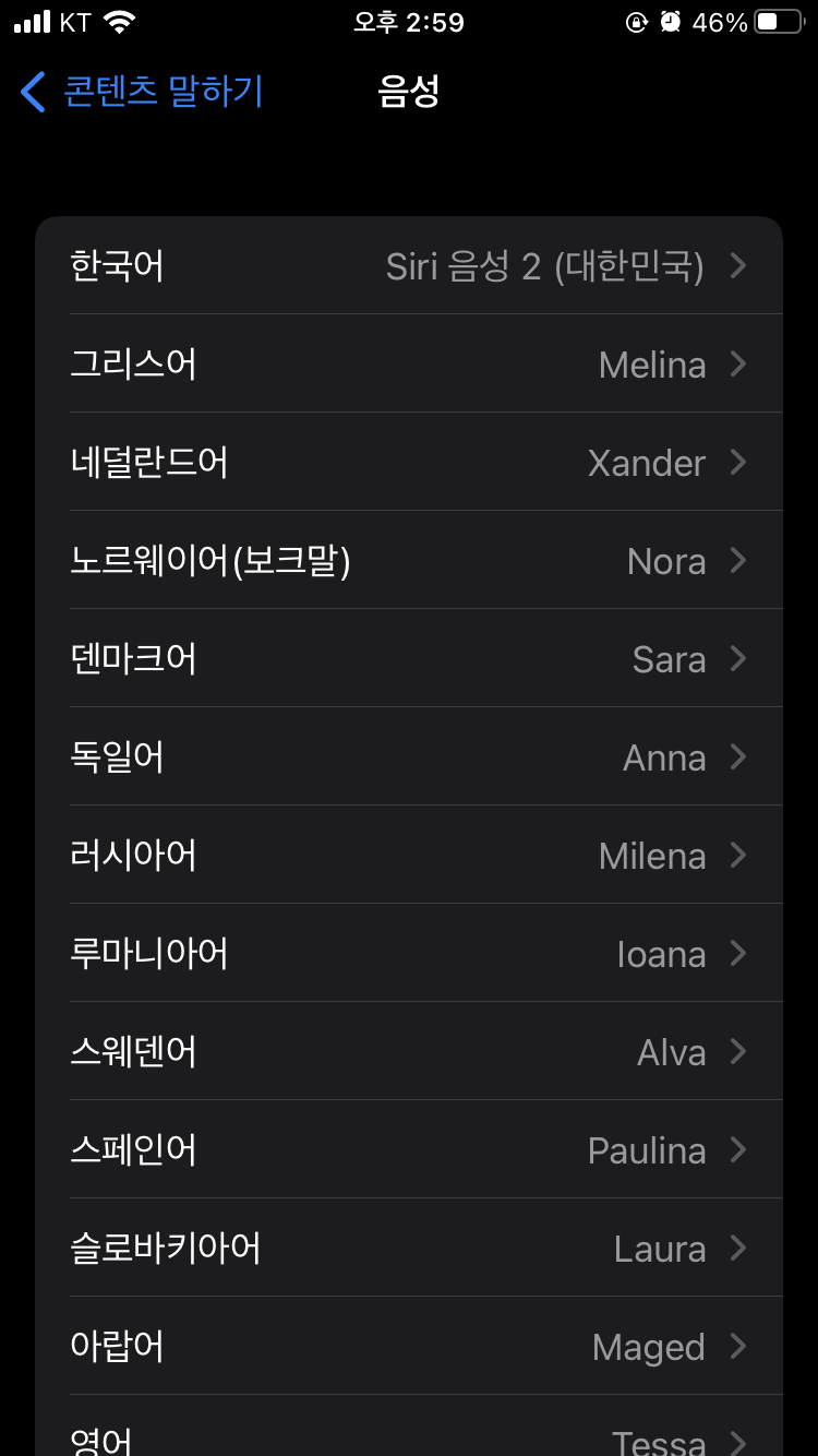 목소리가 마음에 안든다면 콘텐츠 말하기 메뉴 아래에 있는 음성을 눌러서