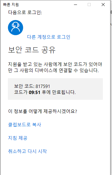 원격하는 사람은 MS계정이 있어야 한다. 지원하기를 누르면