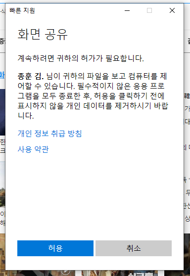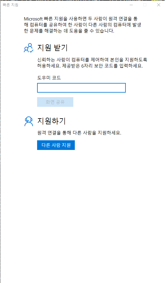윈도우10에 원격접속 솔루션인 빠른지원이 있다. 윈도우10에만 있는 기능이다.