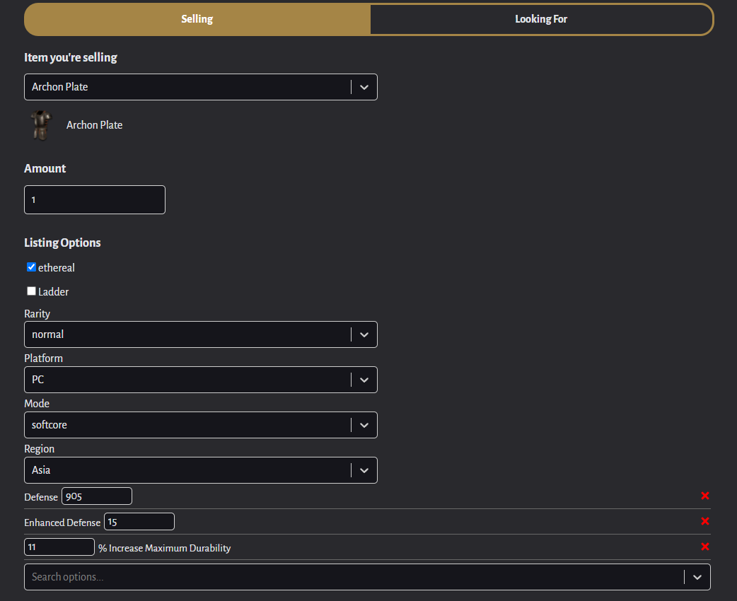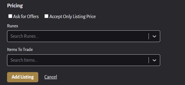 가격 어떻게 할지 선택 하면 된다. 내가 원하는 템이 이나 룬을 적으면 되고 아니면 제시를 선택 하면 된다.
