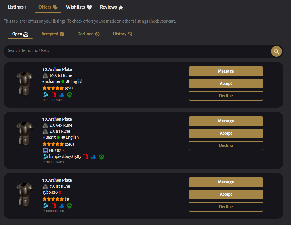 마음에 드는 트레이드가 있다면 accept 하고 메세지 보내고 거래 하면 될듯 하다!