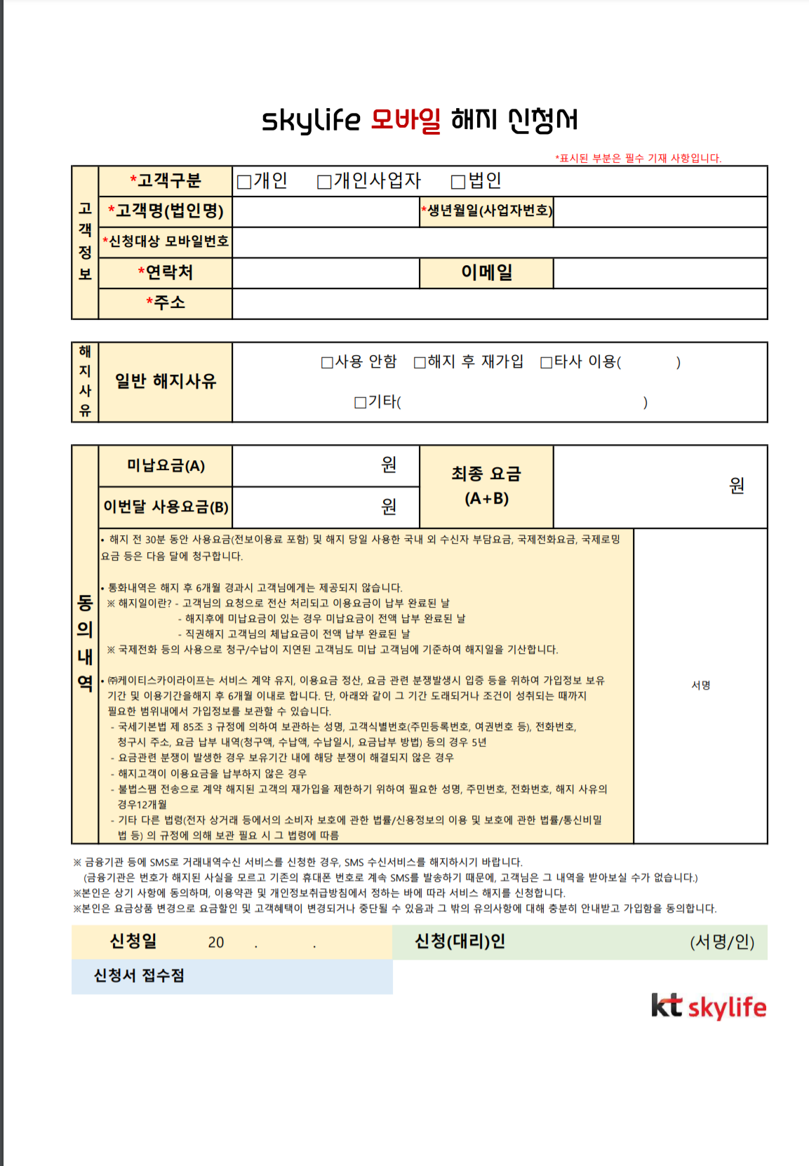 고객정보, 해지사유, 신청일 신청인 까지 작성 해주면 끝난다.
