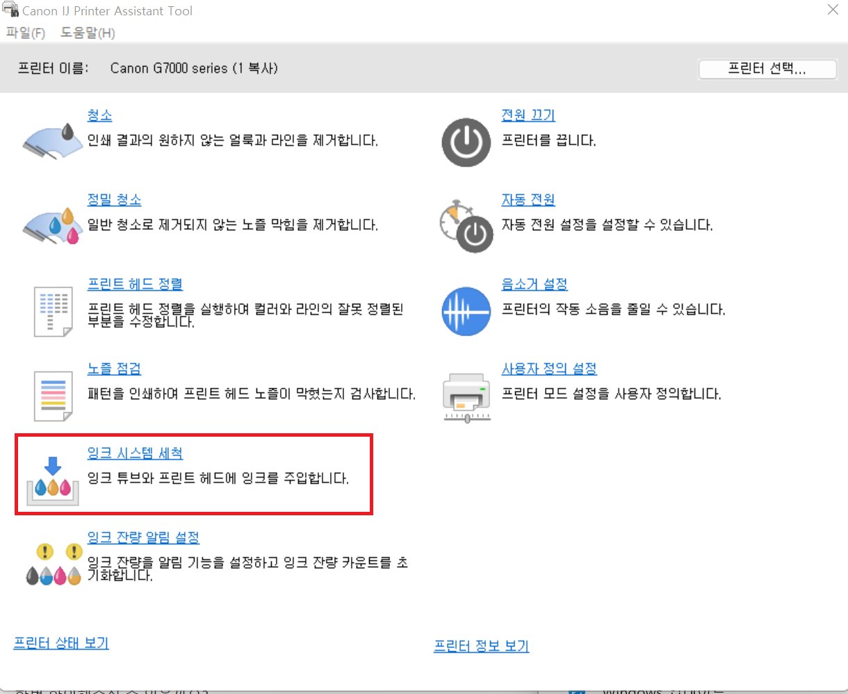 잉크 시스템 세척을 눌러 주자 그럼 잉크가 풀로 찬것을 확인 할 수 있다.