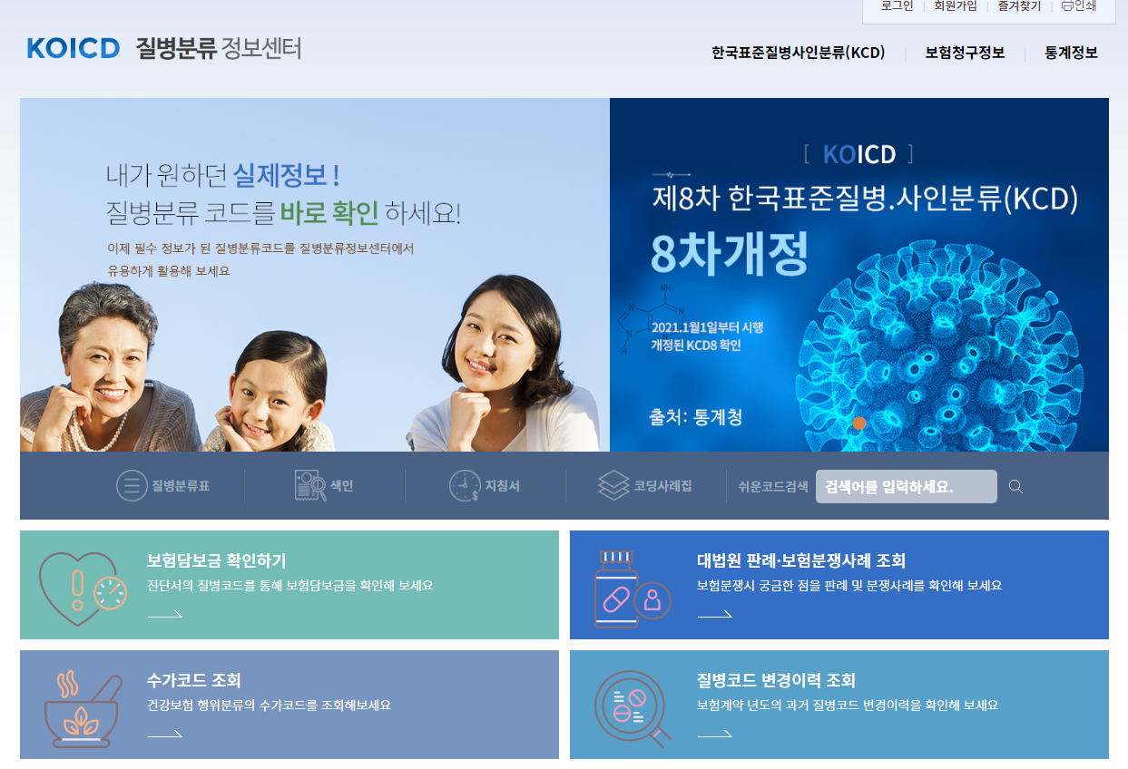KOICD 질병분류정보센터 보험청구 및 보험분쟁시 필요한 질병코드 검색 - KOICD 질병분류정보센터