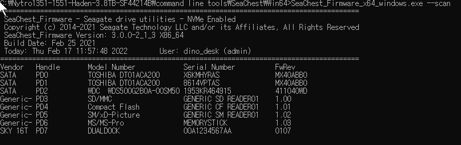 SeaChest_Firmware_x64_windows.exe --scan 입력을 하면