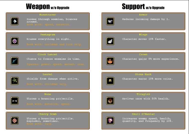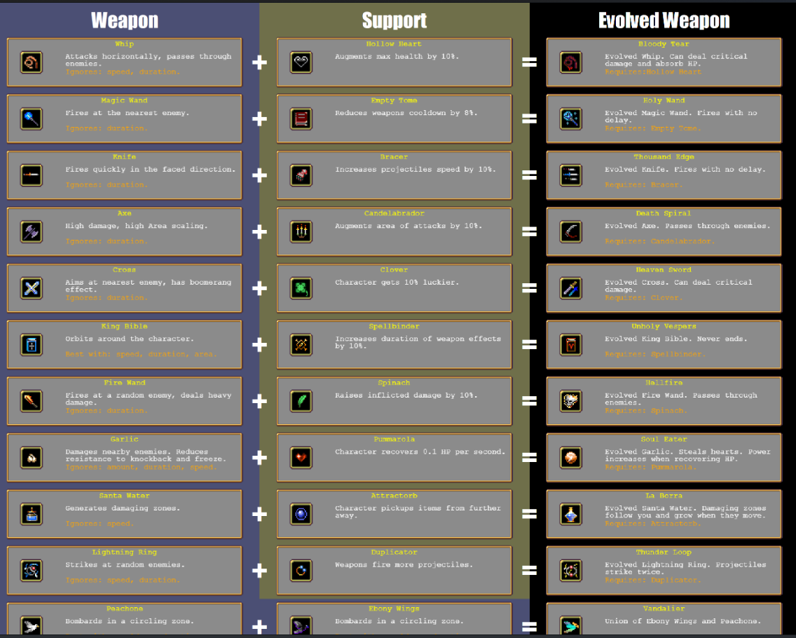 뱀파이어 서바이버즈(Vampire Survivors) 조합표 뱀파이어 서바이벌 조합표