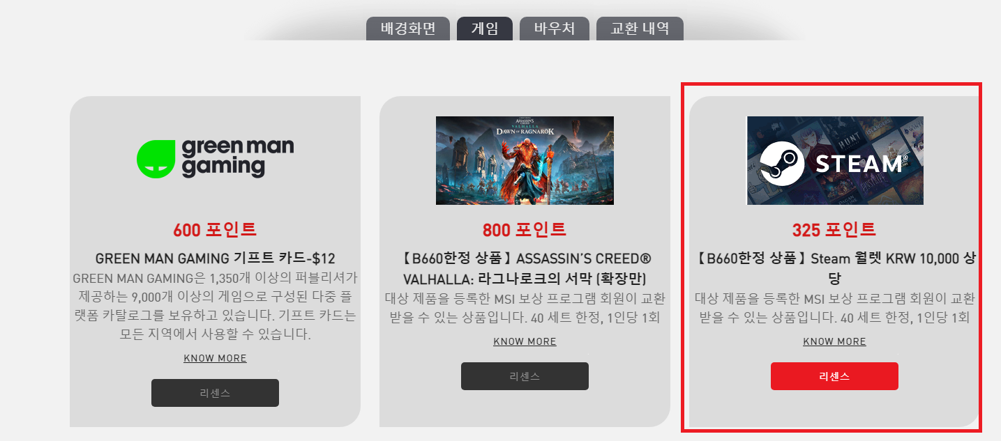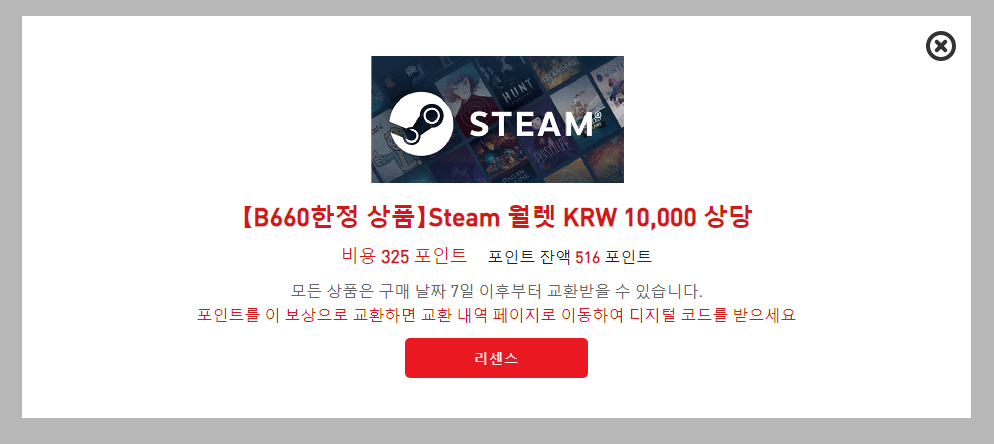 지금은 325포인트로 스팀 1만원 월렛을 받을수 있다.(1년 꾸준이 로그인을 했다면 받을수 있다)