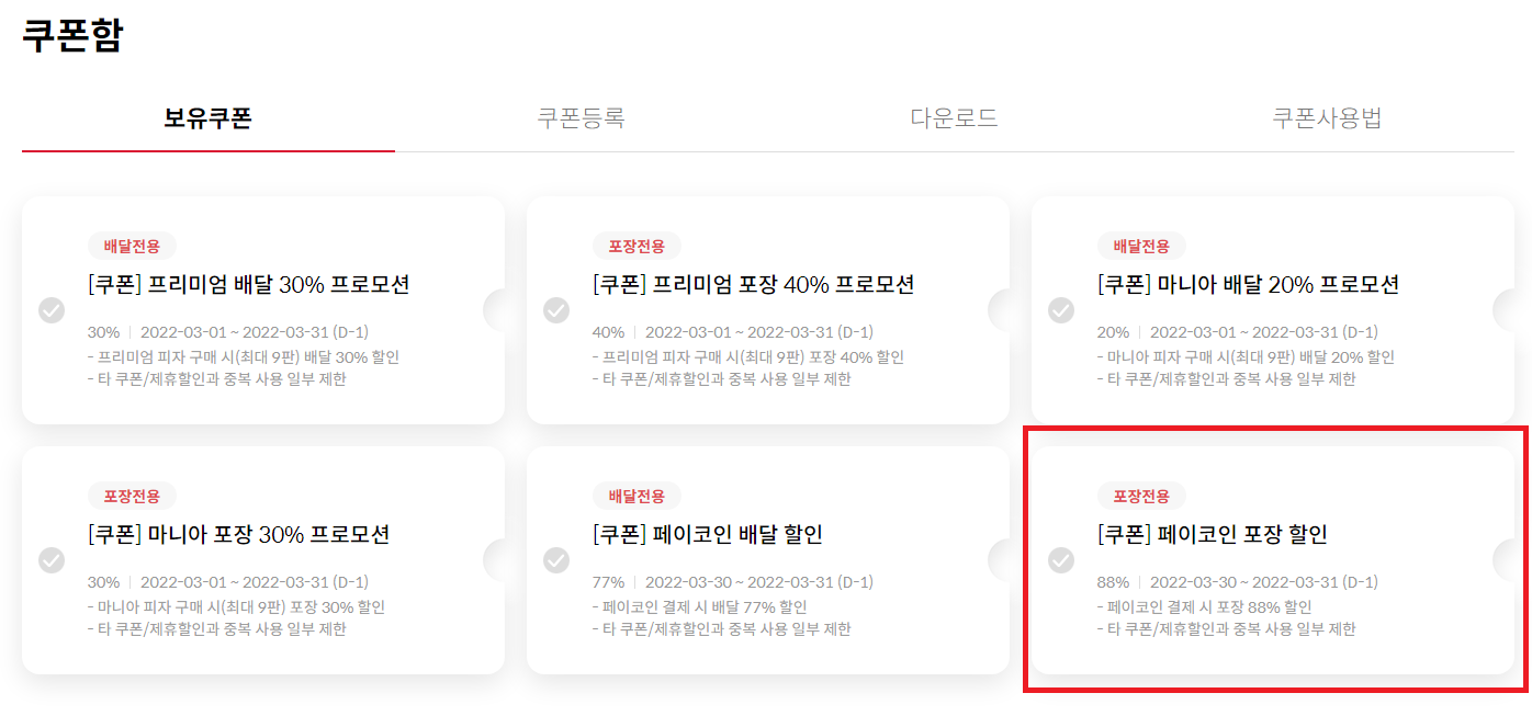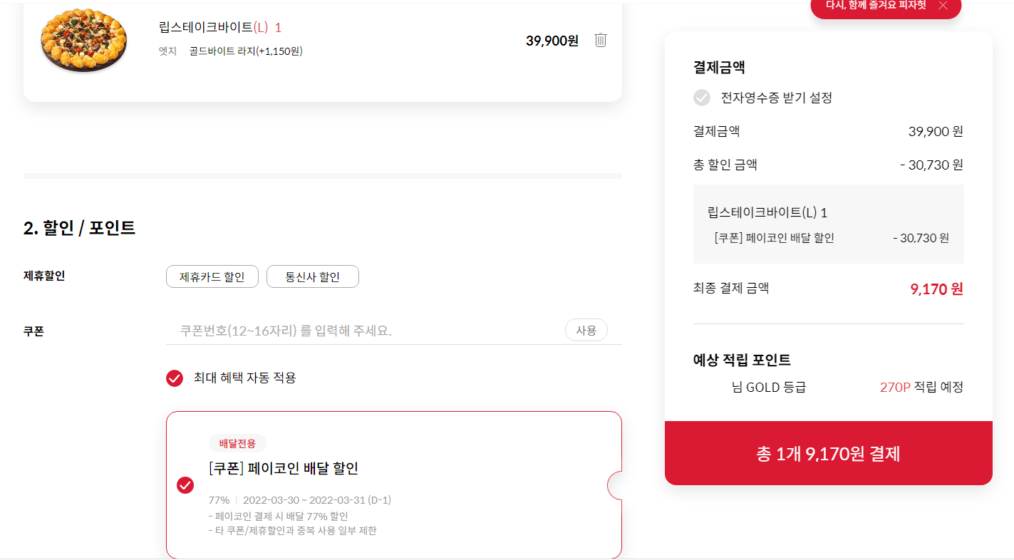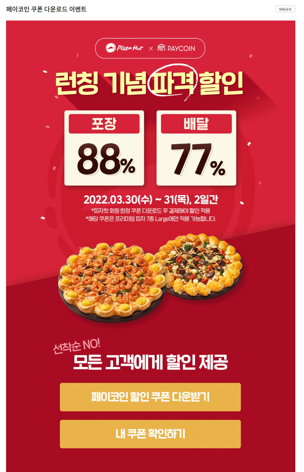 우선 피자헛 포장 88% 배달 77% 할인 2022년 3월30 ~ 31일까지 2일간 진행한다.
