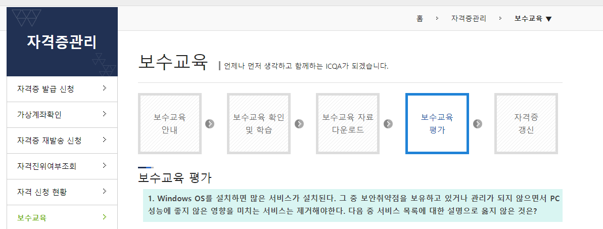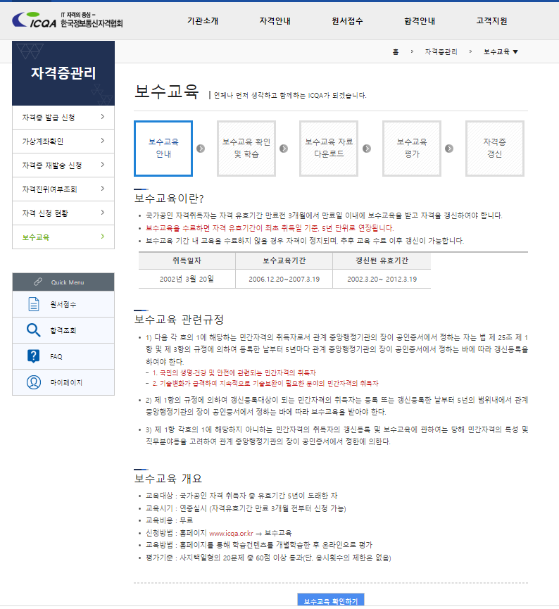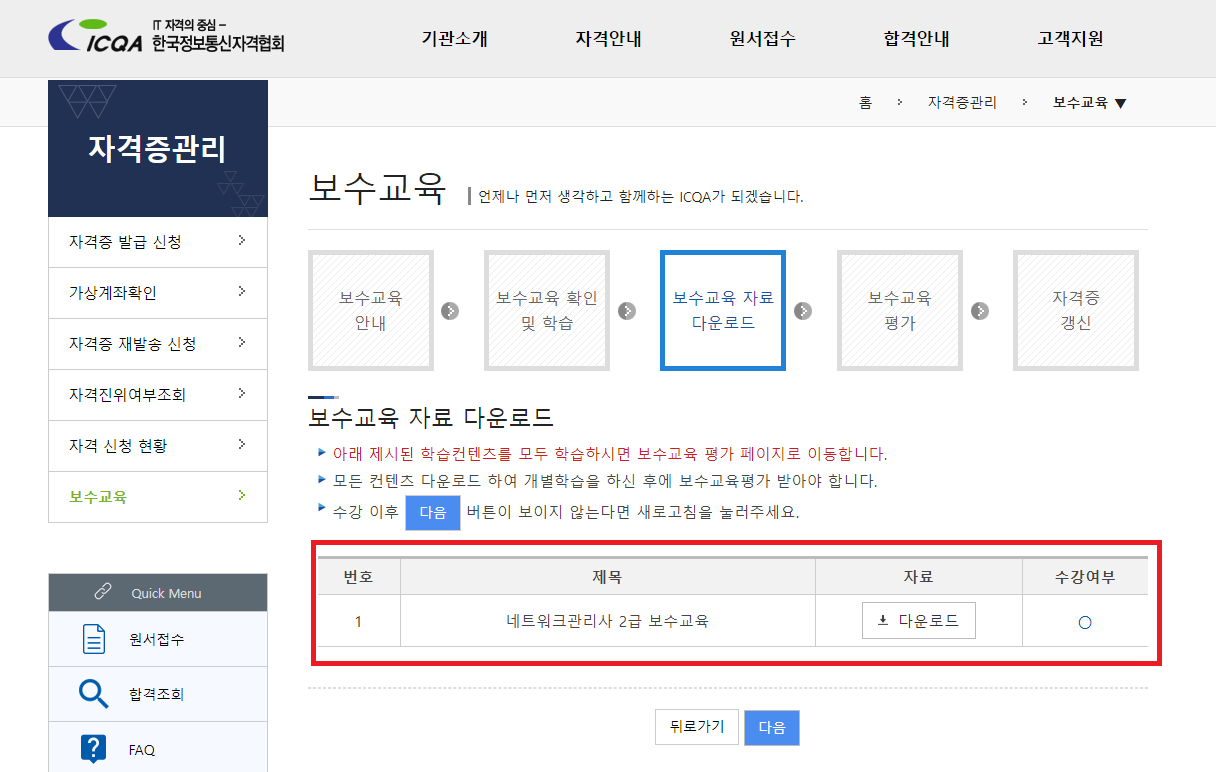 보수교육 신청을 누르면 자격증 자료를 다운 받을 수 있다.