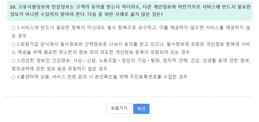 다음을 누르면 시험 문제가 나오고 1번부터 20번까지 객관식 문제가 나온다.