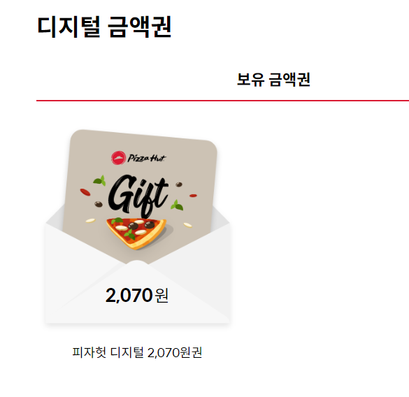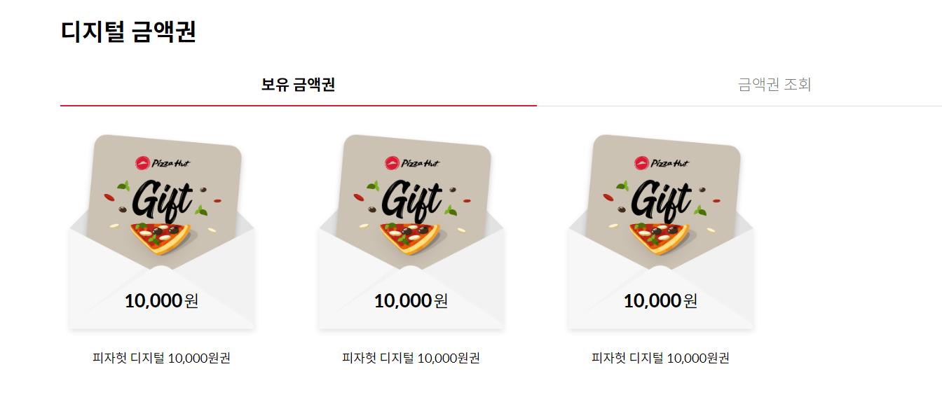 피자헛 사이트 가서 내 계정으로 들어가면 금액권을 입력을 하는 란이 있다.