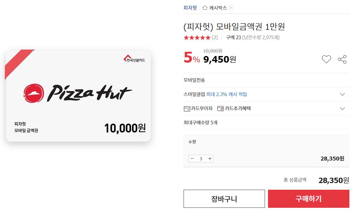 아래와 같이 피자헛 모바일금액권을 상시 5프로정도로 판매 중이다.