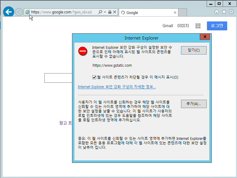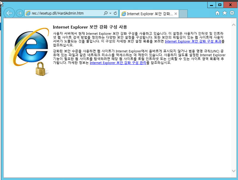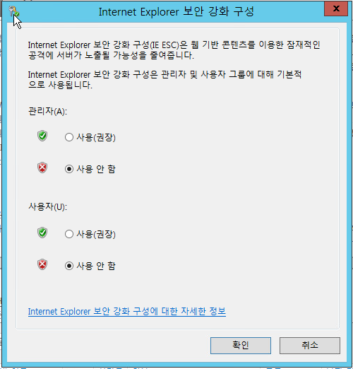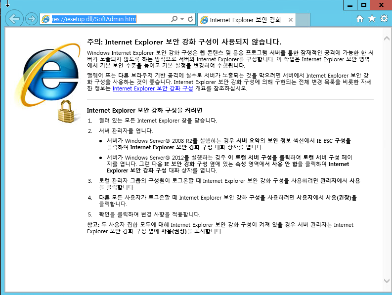 윈도우 서버 설치후 IE 열면 위와 같이 보안 강화 구성 사용이 뜬다.