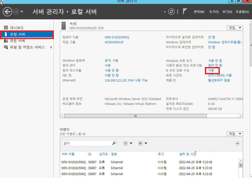 그리고 로컬 서버 들어가서 IE 보안 강화 구성을