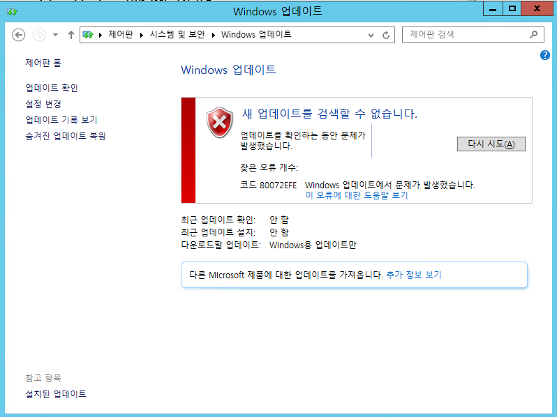 윈도우 2012 업데이트시 위와 같이 에러가 발생된다.