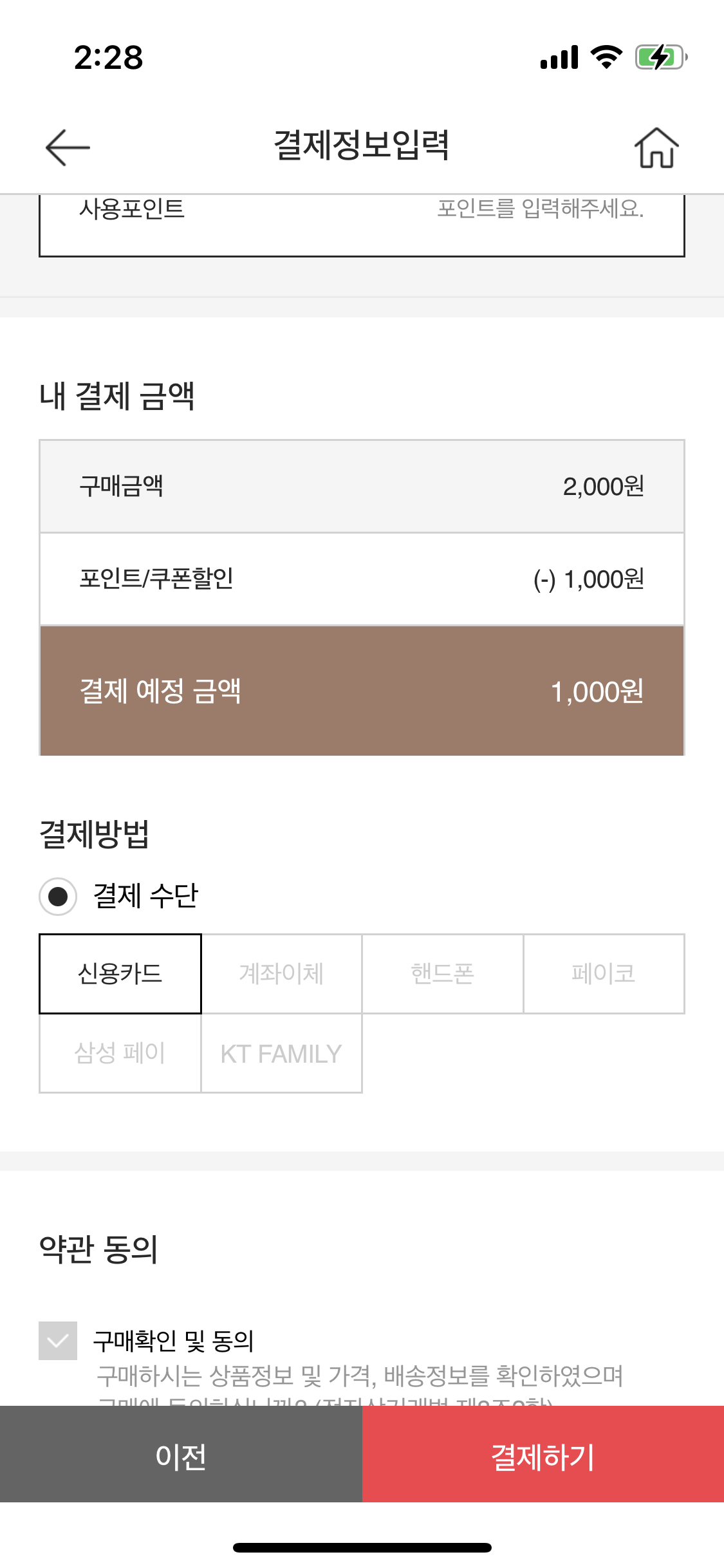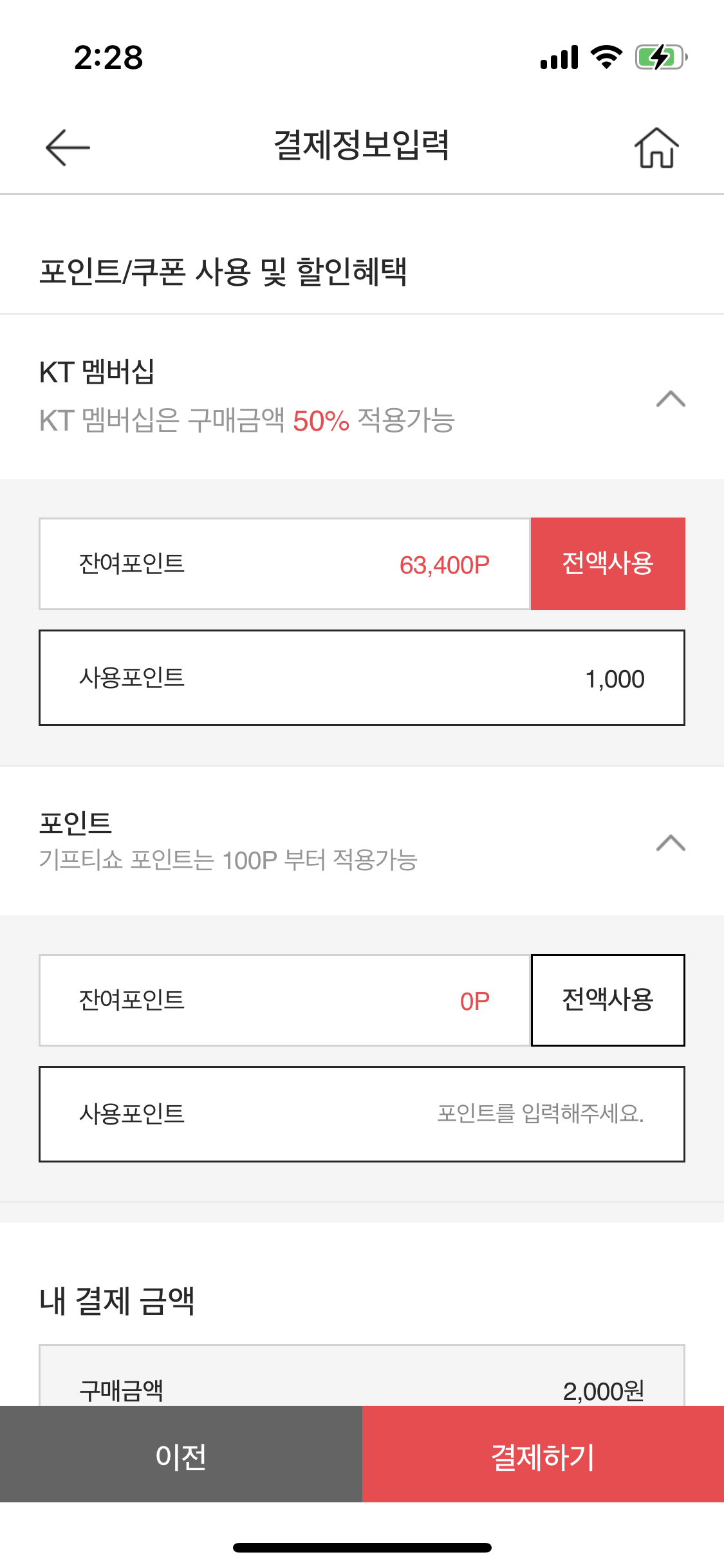KT 포인트를 1,000점 사용하고 결제 하기 하면