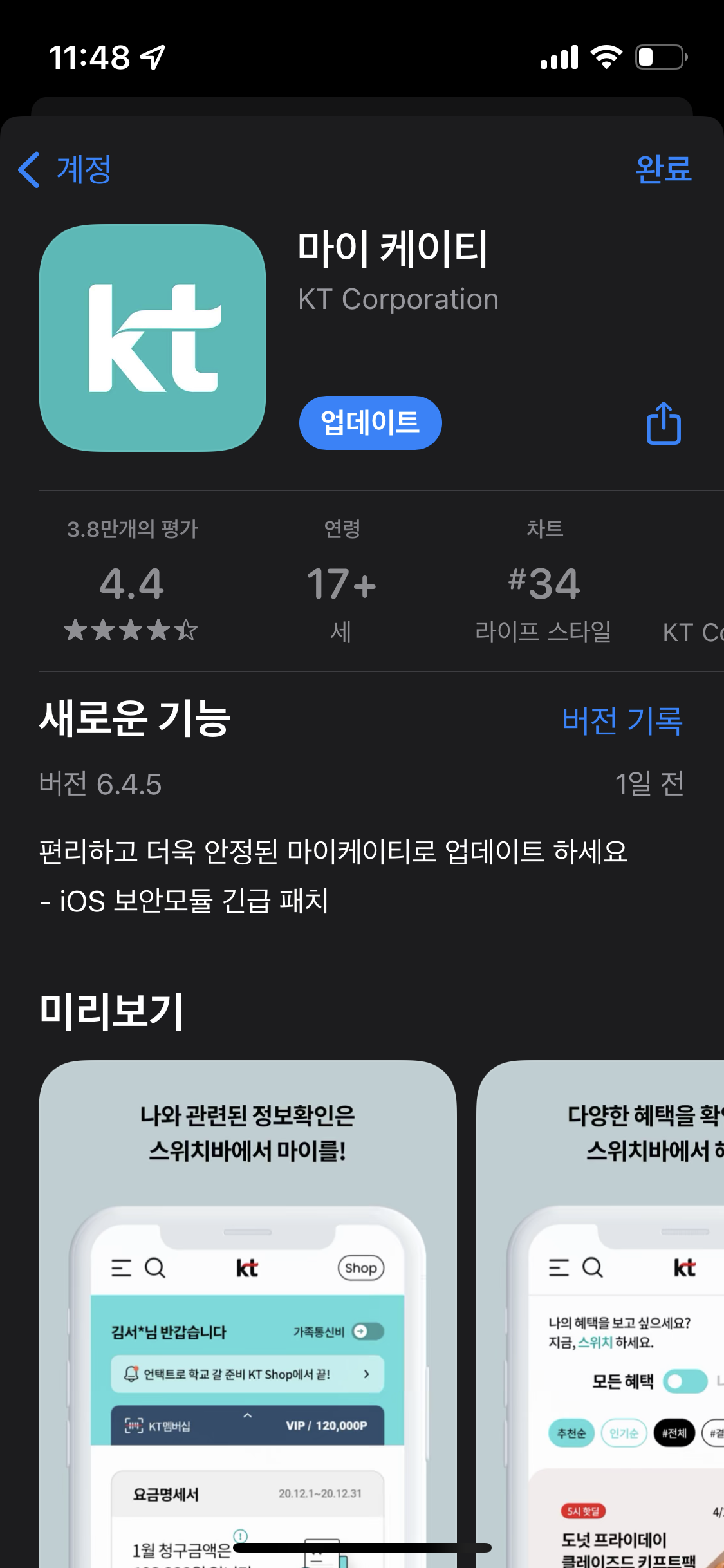 이건 폰 문제가 아닌 마이 케이티 어플 문제다. 기다리면 해결이 된다.