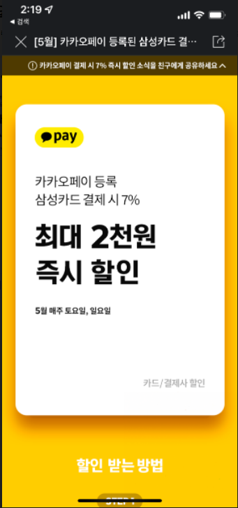 5월 매주 토,일 카카오페이 삼성카드로 결제시 7%, 최대 2천원