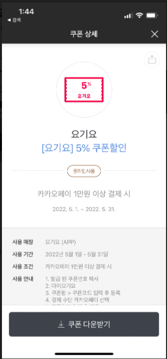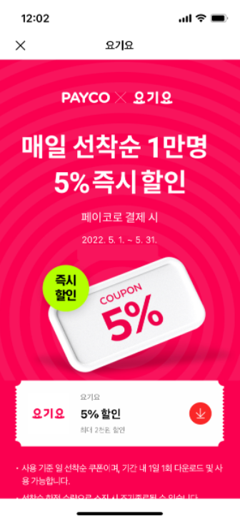 1일 1회 다운로드 1만원 이상 결제시 5% 할인, 기간내 1회 가능