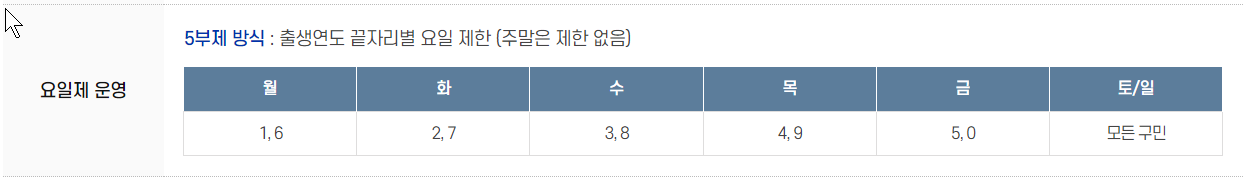 5부제 방식이라 생년월일 뒷자리 번호를 보고 요일별로 신청하자.