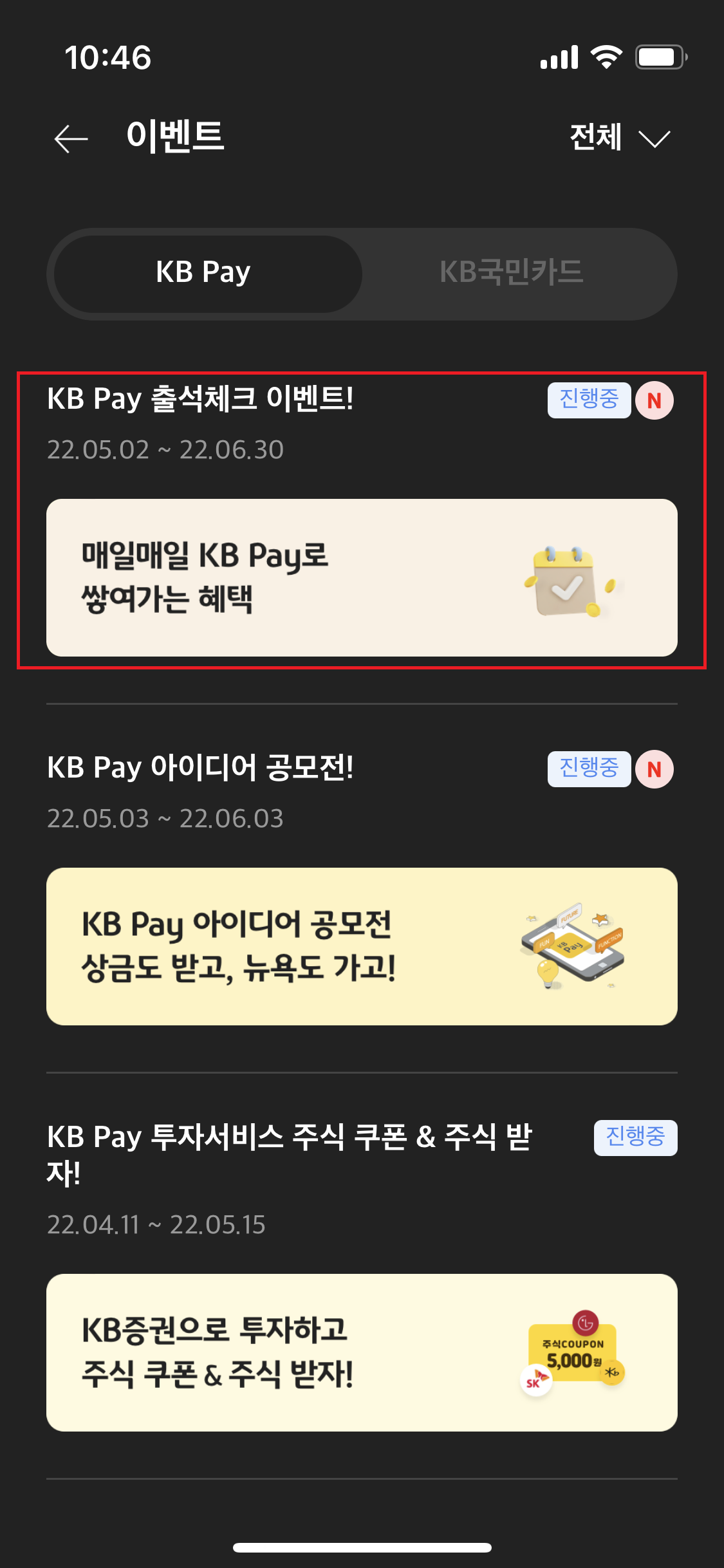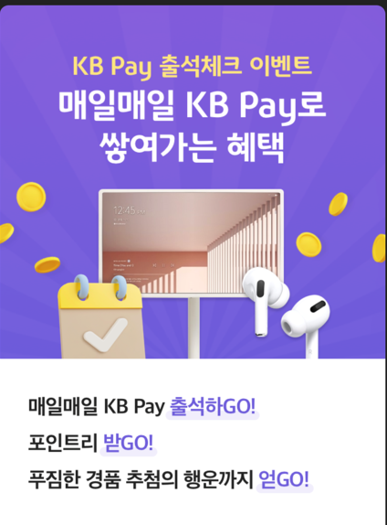 KB Pay 출석체크 이벤트를 하고 있다 국민카드 사용자라면 줍줍이 용으로 괜찮을듯 하다.