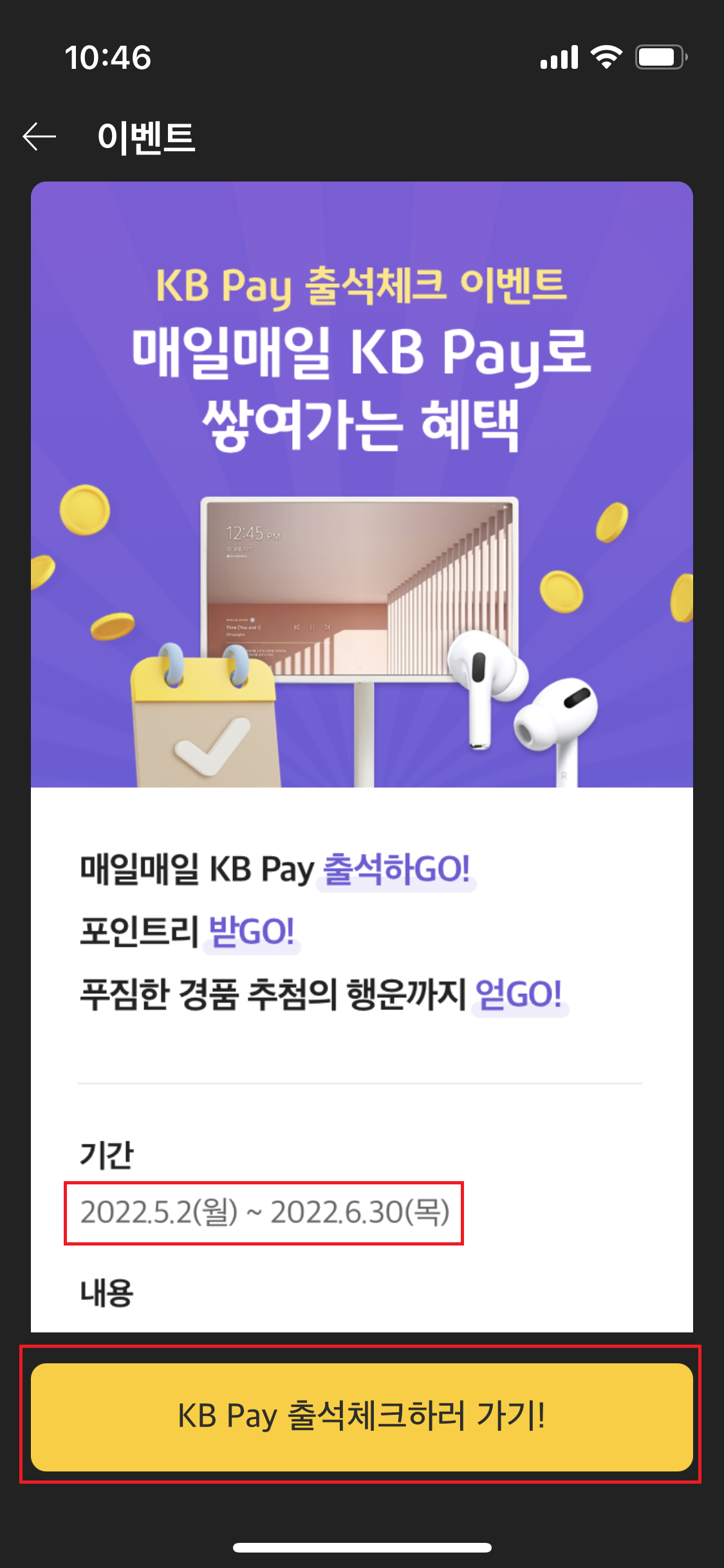 5월 2일 부터 6월 30일까지 하는 출석체크 이벤트다. 아래 KB Pay 출석체크하러 가기 눌러보자