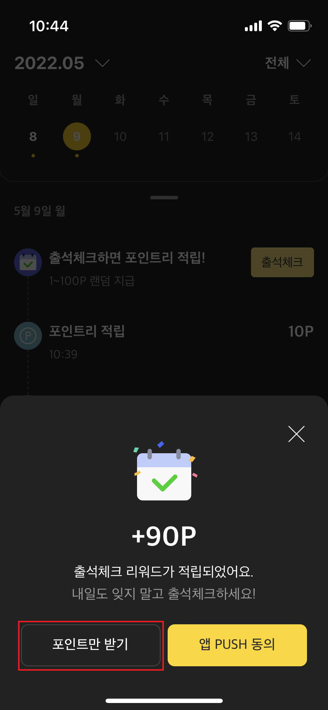 조금만 기다려 보면 가운데 윗쪽에 출석 체크가 활성화 되고