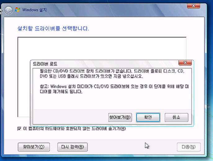 설치 할일이 있어서 설치를 하려면 하드 인식 불가.