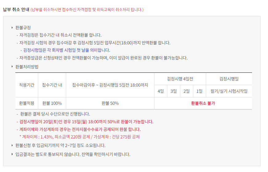 접수기간내에 100% 환불이다. 하지만 접수마감이후 검정시행일 5일전 18:00 까지는 50%